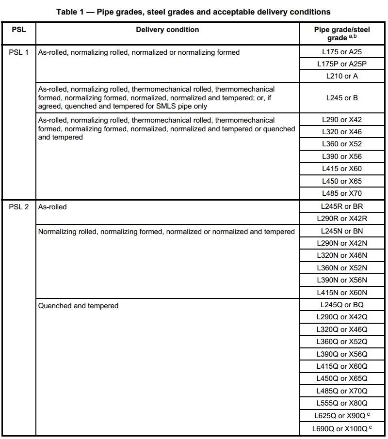a. The letter L followed by the specified minimum yield strength in Mpa. For example, L290 (X42) means the minimum yield strength is 290 Mpa. In case of PSL2 pipe, Suffix letter (R, N, Q or M) shall be added to describe the delivery condition;